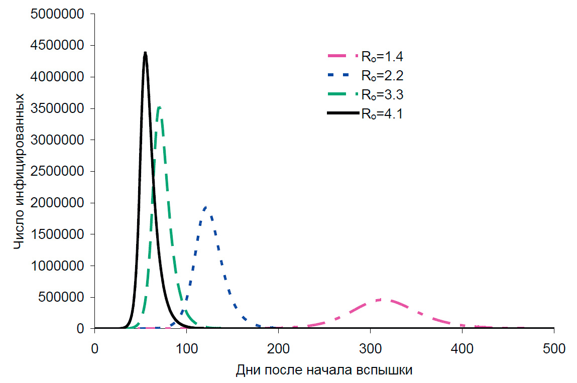 В последние дни появились работы, в которых моделируется развитие эпидемии при различных параметрах [13, 14, 15]. Важно понимать, что эти модели — не прогнозы. Во-первых, точность, с которой оценен R0, совершенно недостаточна. При R0~3 в отсутствие каких-либо мер и без предсуществующего иммунитета вспышка, например, в десятимиллионном городе будет быстрой и острой, будет иметь пик через два-три месяца, и на пике будут одновременно инфицированы десятки процентов населения [15]. Если же R0 ниже двух, то пик растянется на много месяцев и будет смазан (рис. 3).