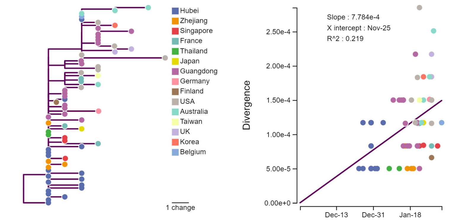 Рис. 2. Эволюционное древо nCoV [7] (слева) и расстояние между образцом и корнем дерева в зависимости от даты получения образца